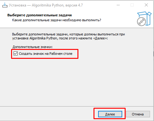 - Выбрать, создавать ли ярлык на рабочем столе, и нажать “Далее”.