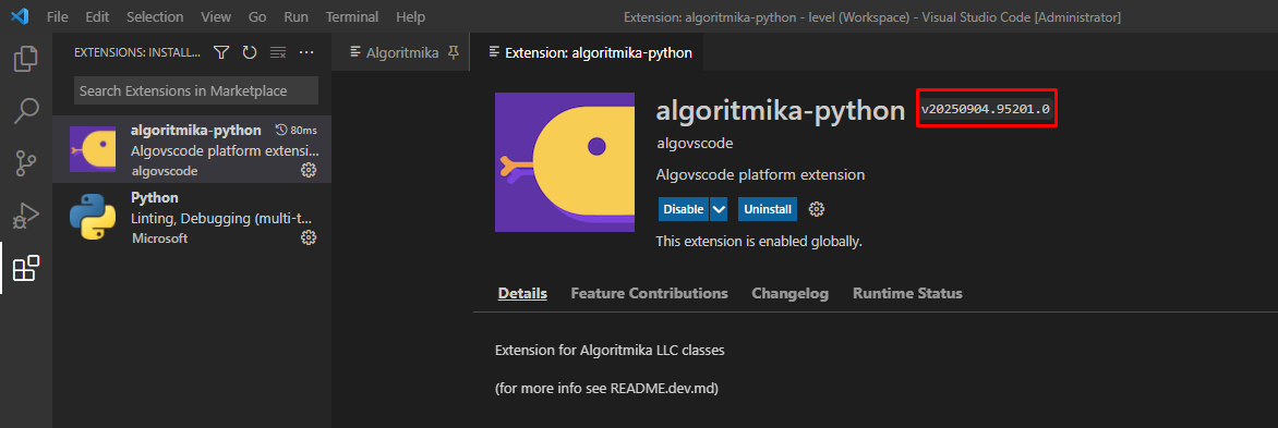 Версия расширения algoritmika-python должна быть не ниже: v20250904.95201.0
