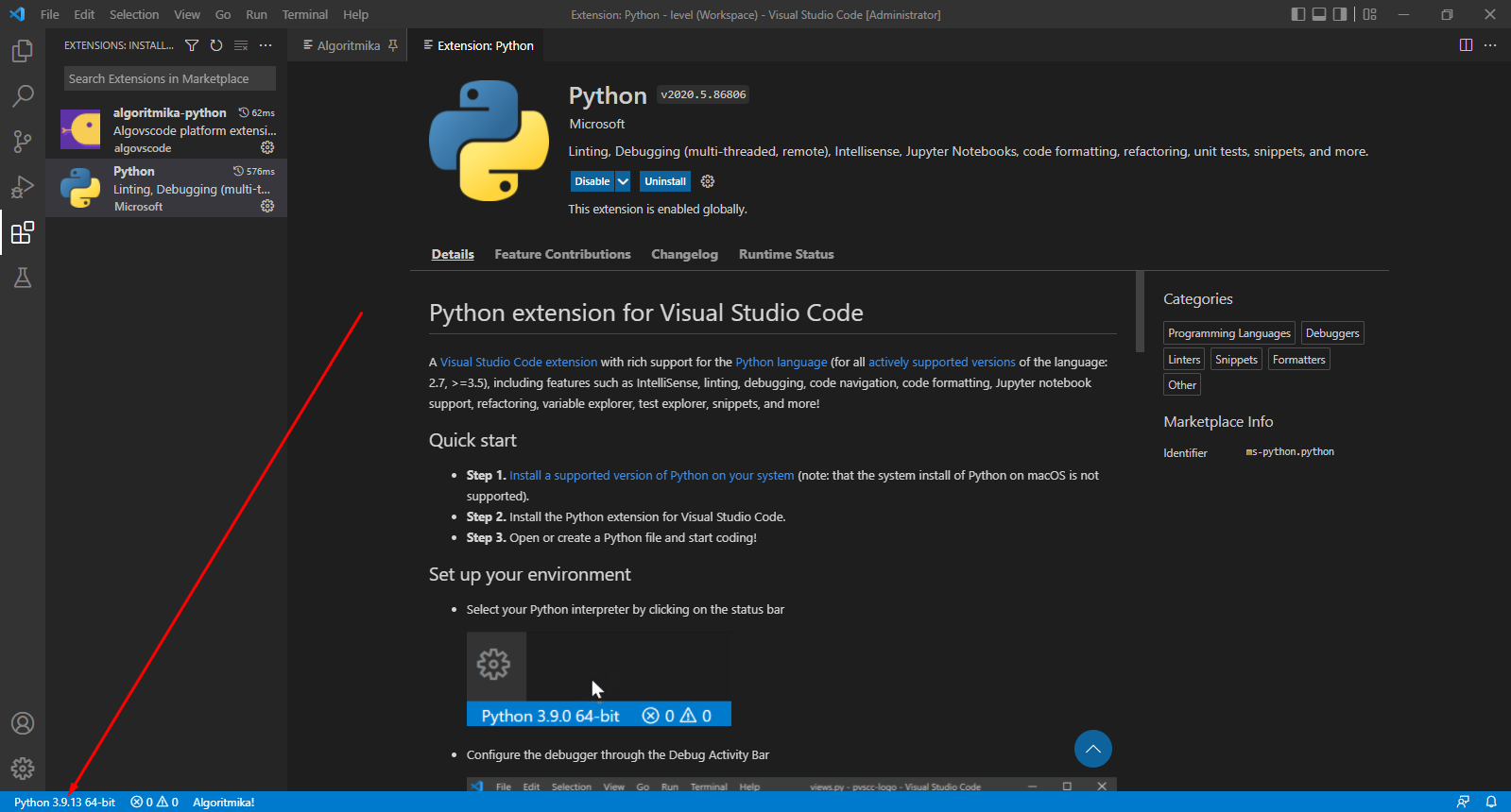 Среда разработки Visual Studio Code отображает в левой нижней части окна то, каким интерпретатором языка программирования Python она будет пользоваться:
