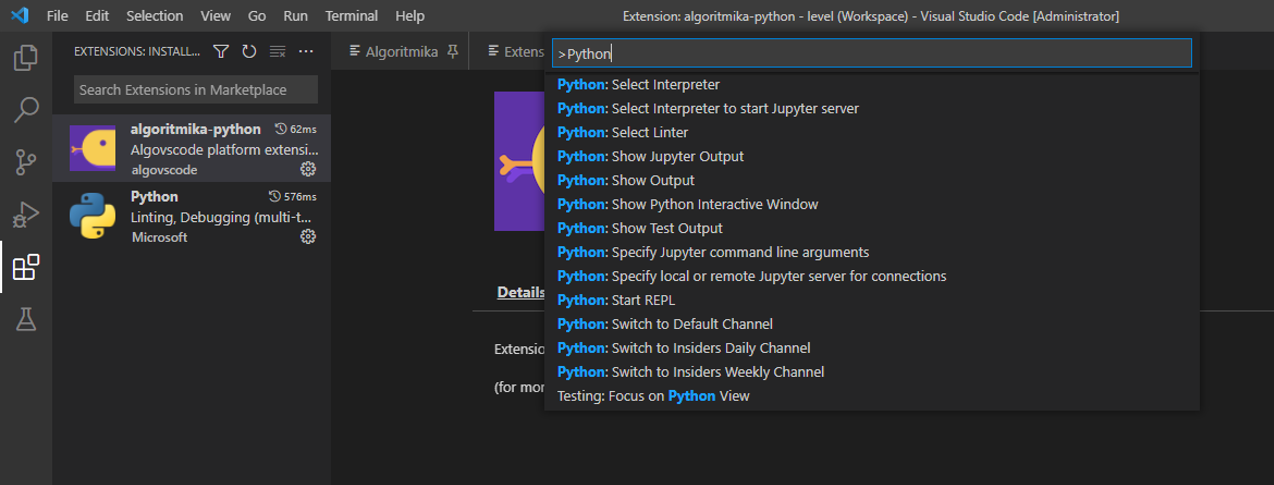 - Наберите комбинацию Ctrl+Shift+P и в открывшемся окне начните печатать: Python